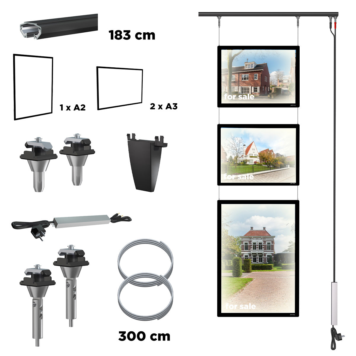 Este set es ideal para exponer ofertas de viviendas en inmobiliarias. Al combinar Porta carteles LED A3 y A2, podrá crear un expositor LED dinámico y atractivo que destaque lo mejor de su oferta inmobiliaria.