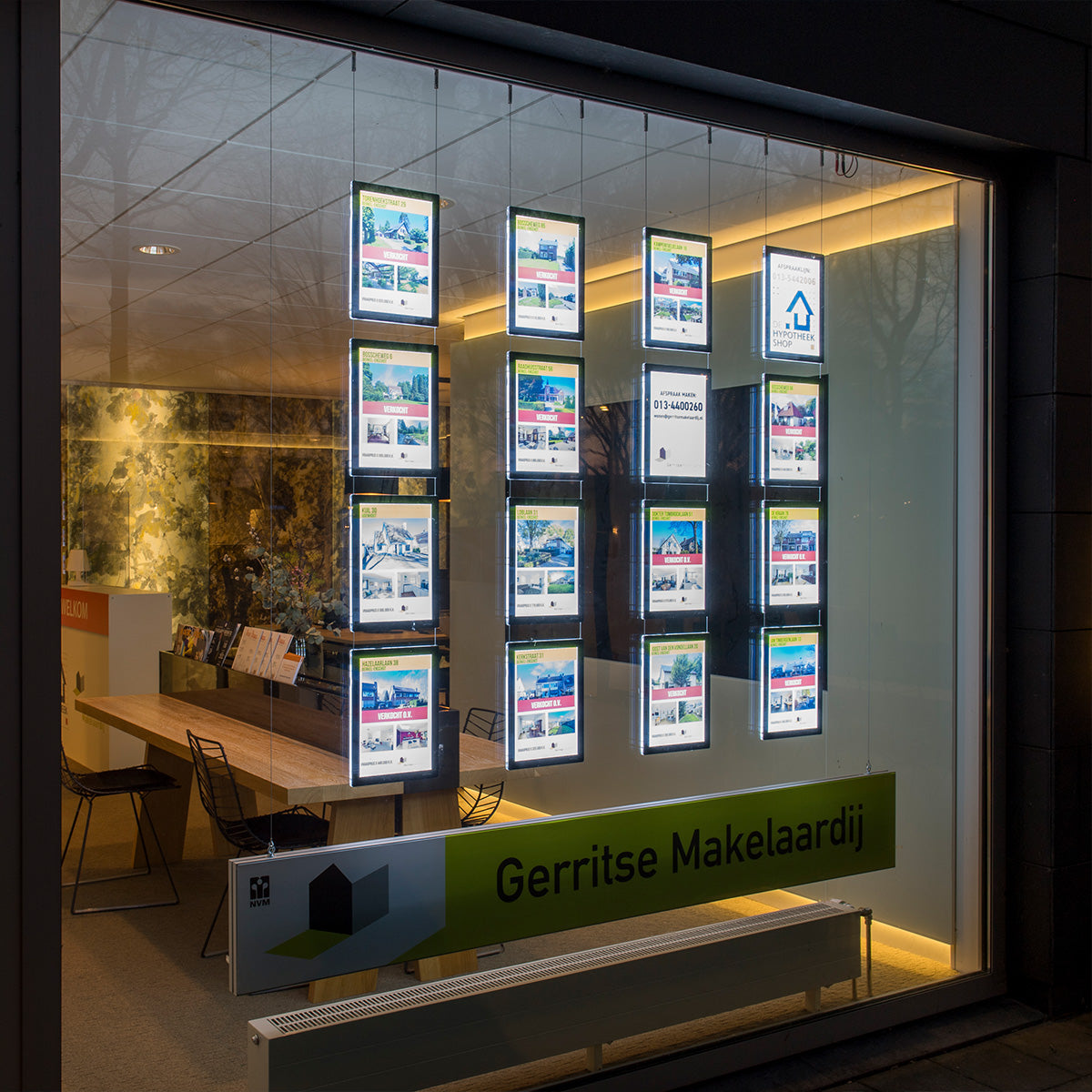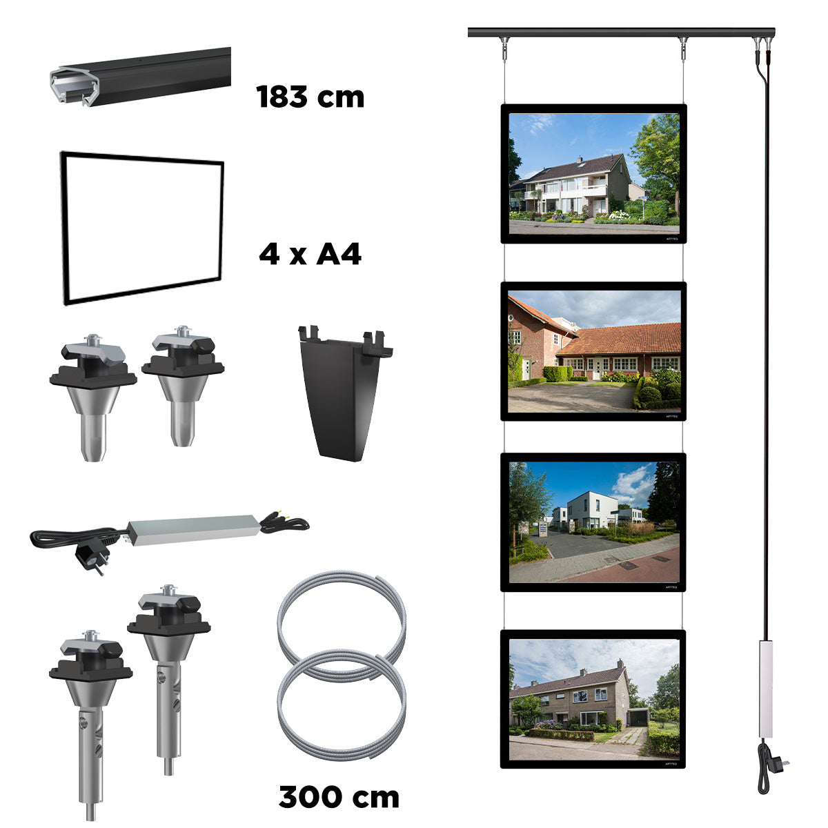 Este set es ideal para inmobiliarias y comercios que buscan un escaparate LED dinámico y flexible. Gracias a los cuatro Porta pósters LED A4, podrá mostrar ofertas y listados de forma clara, organizada y con gran impacto visual.